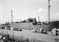 At Tulagi in the Southwest Pacific about 20 July 1943 receiving USS Saint Louis (CL-49) alongside for initial repair of torpedo damage received in the Battle of Kolombangara on 13 July 1943.