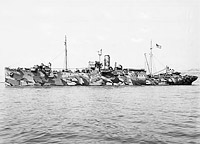 The main alteration was the filling in of her well deck forward, as had been done over two years earlier in her sister. The disruptive pattern camouflage may be the variant of Measure 31 that used green paints.