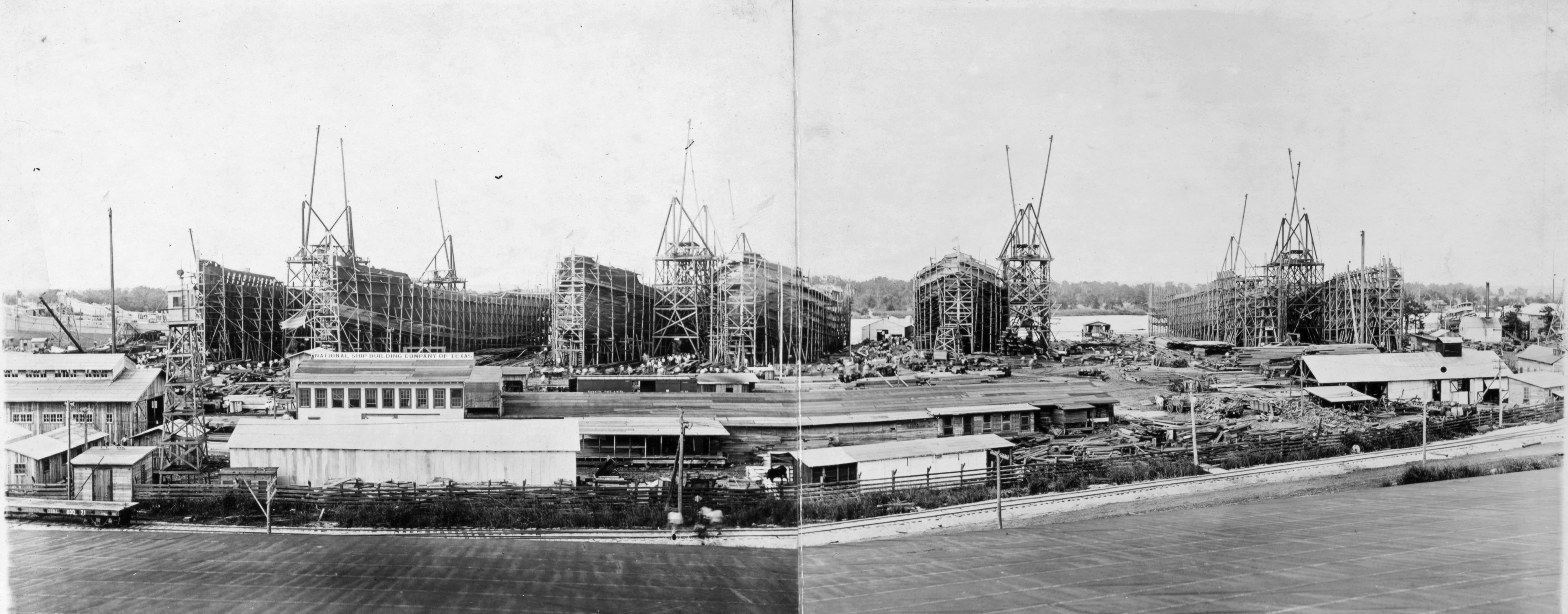 National Ship Building Company of Texas A panoramic view of the yard received by the EFC District Supervisor, Alexander Matland, probably on 14 August 1918. There are two ships fitting out afloat at far left, five ships well along on the ways plus a probable vacant way in the center, and two ships taking shape on the right. The photo may have been taken after Boreta, the second ship in the July 1917 EFC order, was launched on 26 June 1918 and before Natenna, the tenth ship, was laid down on 1 July 1918. Photo No. 165-WW-504A-72 Source: U.S. National Archives, RG-165-WW |