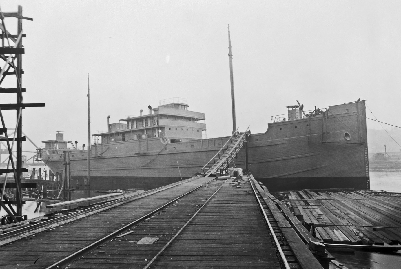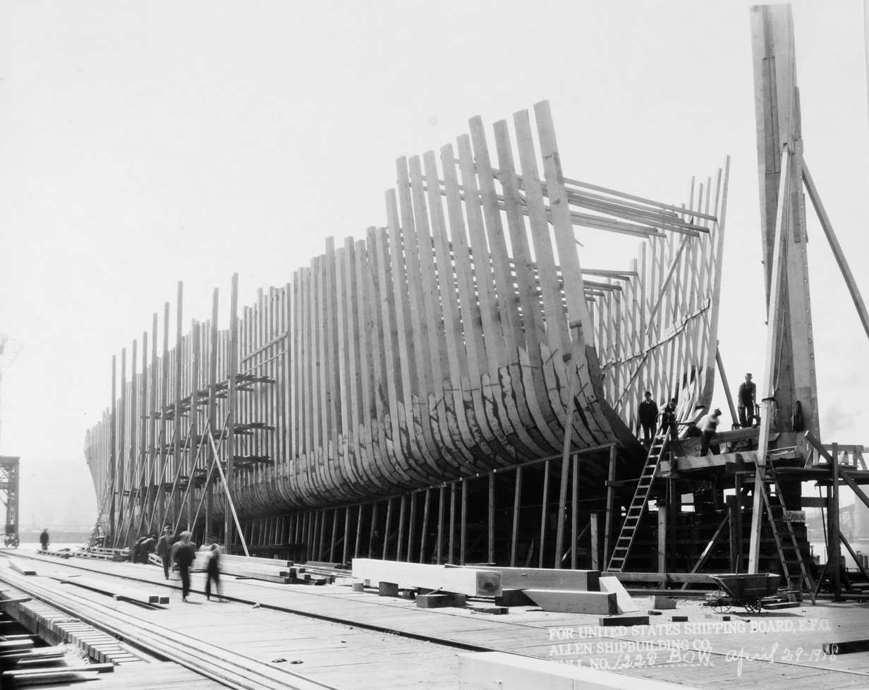 | S.S. Bosworth (Design 1008, EFC Hull 1228). This ship was built by the Allen S.B. Co, Seattle, Wash. and is shown here fitting out afloat on 30 September 1918. She was completed and delivered to the Emergency Fleet Corporation in June 1919. (U.S. National Archives, RG-165-EO Album 2-C) (Click photo to enlarge) |