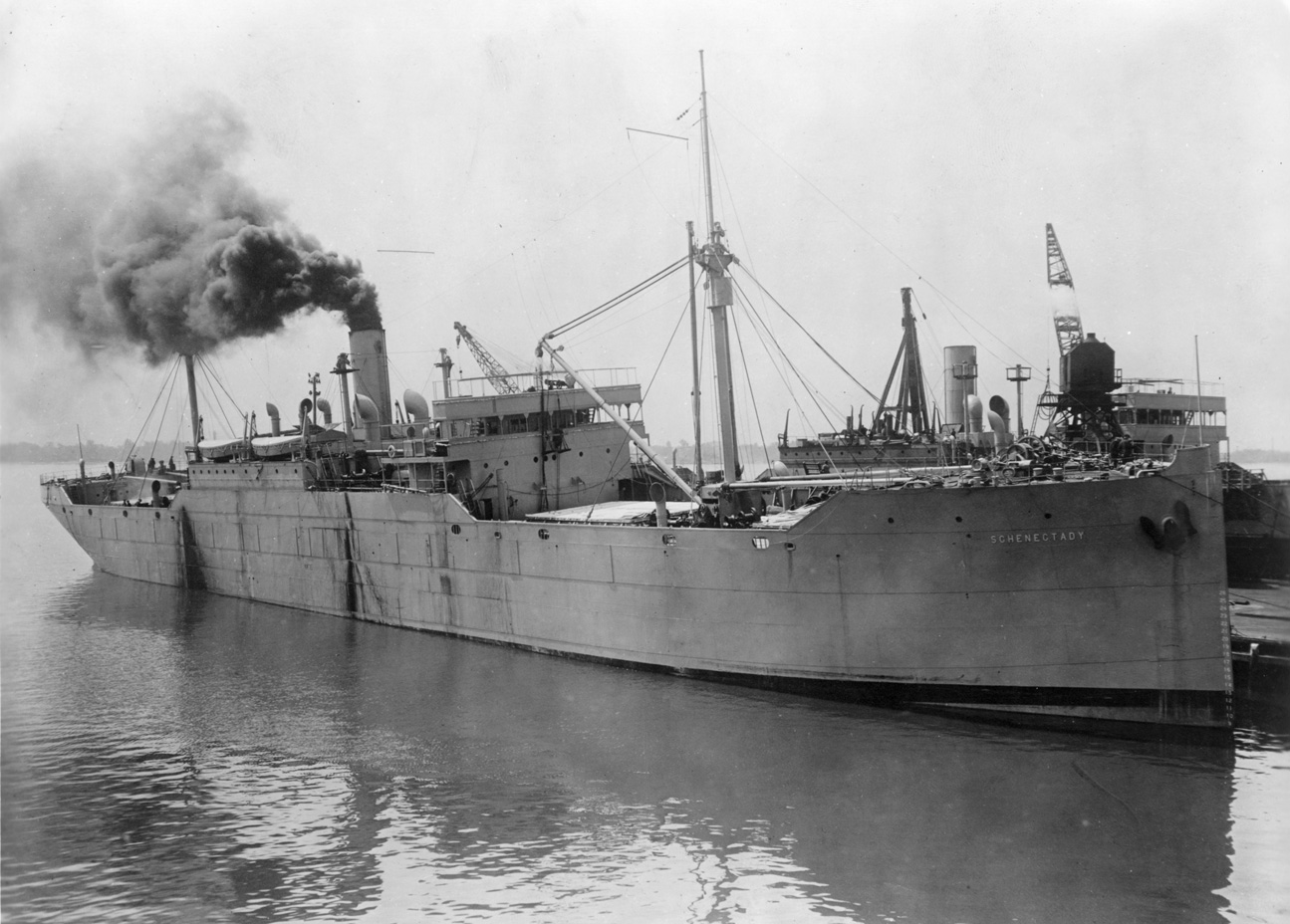 S.S. Schenectady (Design 1022, EFC Hull 511) on 30 April 1919 in a completion photo taken by her builder, the American International S.B. Co, Hog Island, Pa. She has a standard peacetime rig in place of the special wartime rig shown in the drawing above. (NARA: RG-32-UB box 34) (Click photo to enlarge) |