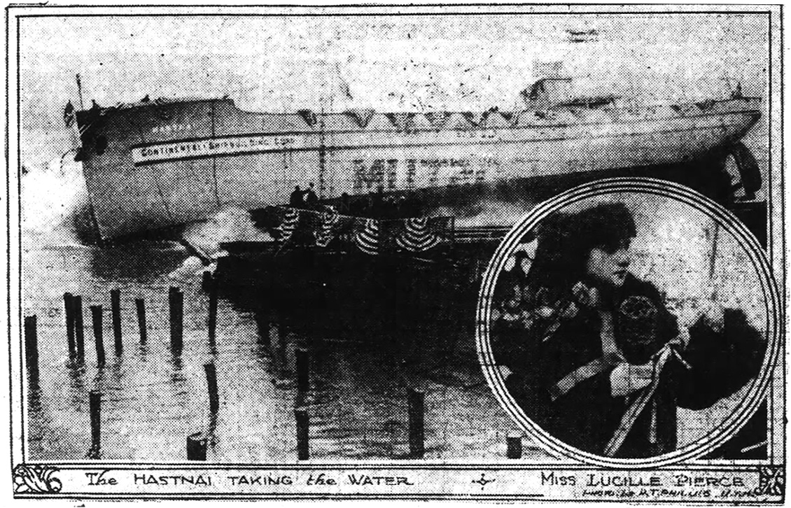 | "The largest side launching that has ever taken place along the Atlantic seaboard was carried out at Yonkers, N. Y., when the 1,500-ton coal carrier, the Hastnai, built for the United States Shipping Board, took the water. Continental Shipbuilding Corporation officials announced that this is also the largest of its kind ever built by the United States Shipping Board.... Miss Lucille Pierce, of Riverdale, N. J., daughter of Adrian S. Pierce and niece of Selah V. Masten, president of the Continental Corporation, acted as sponsor for the Hastnai. The name selected for this vessel is of Indian origin and was suggested by Mrs. Woodrow Wilson." (The Washington Post, 18 April 1919, page 3, via newspapers.com.) (Click picture to enlarge) |