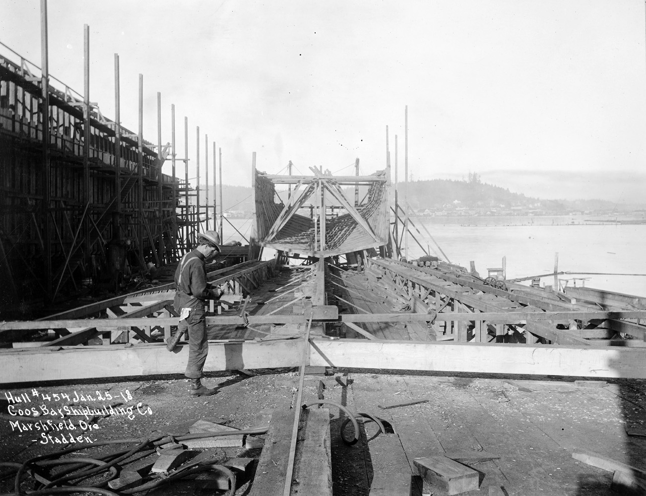 Cocopa (Design 1114, EFC Hull 435) at Wilmington, California, in the Design 1114 barge configuration used for three incomplete Hough Design 1003 ships (EFC Hulls 431, 435, and 454). In this conversion the large bridge house amidships was removed and replaced with a miniature bridge-like shelter for the barge crew and the empty machinery spaces were converted into another cargo hold. The long bridge island of the Hough design with its additional cargo capacity, was retained, as were its two pole masts. (NARA: RG-32-CV-7-5-49, as reproduced in Louis Hough, A Fleet To Be Forgotten: The Wooden Freighters of World War One, San Francisco Maritime Press, 2009, page 215.) |