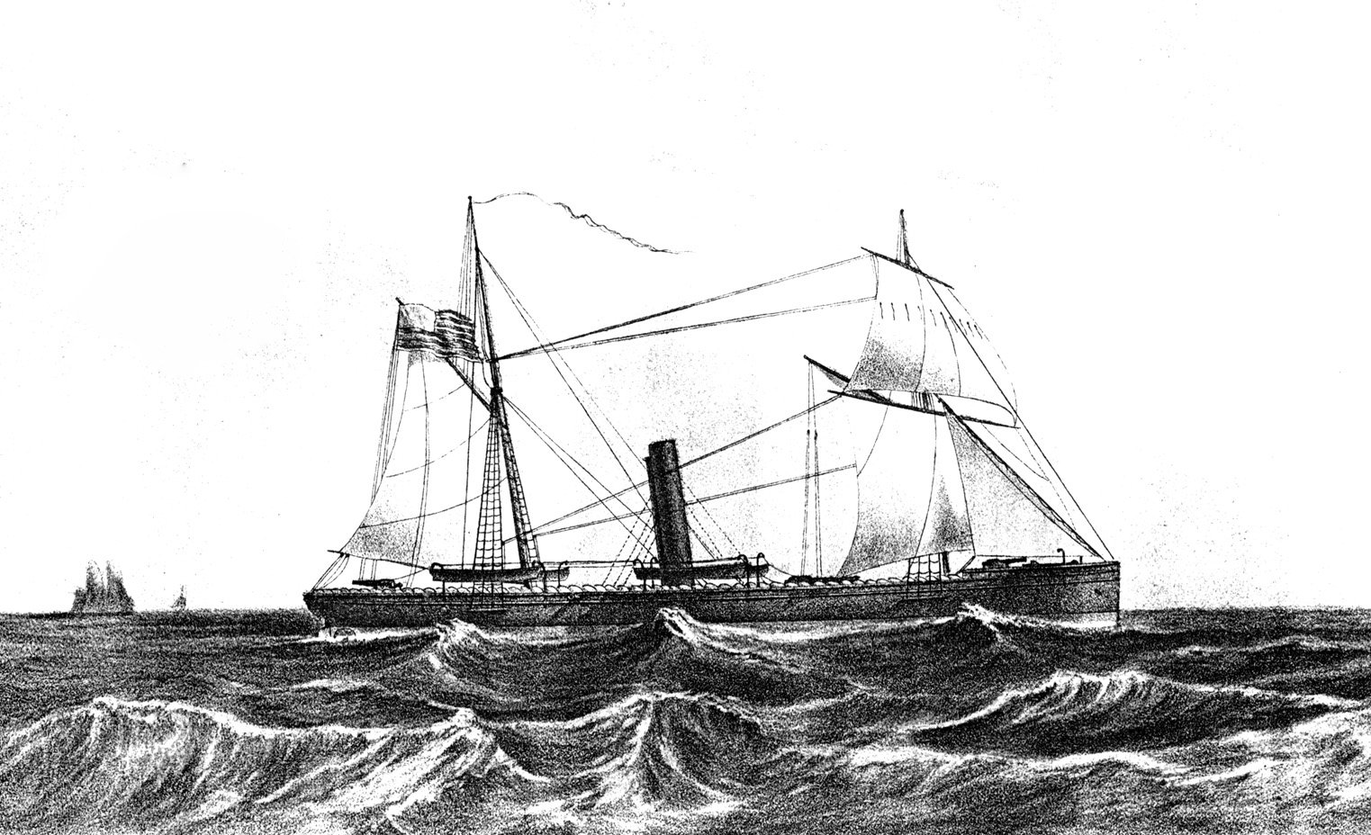 Pacific Station, 1868-1871. No illustrations. She was neither rearmed nor refitted after the Civil War and would have resembled this image of USS Nipsic (1) by the Major & Knapp Engraving, Manufacturing, and Lithographic Company, 71 Broadway, New York, that was drawn by M. B. Woolsey, U.S.N. Printed in color between 1867 and 1872, it shows the ship before 1869 with a vertical bow, two masts, and an armament of one 11" pivot gun and two 8" or 9" guns.
