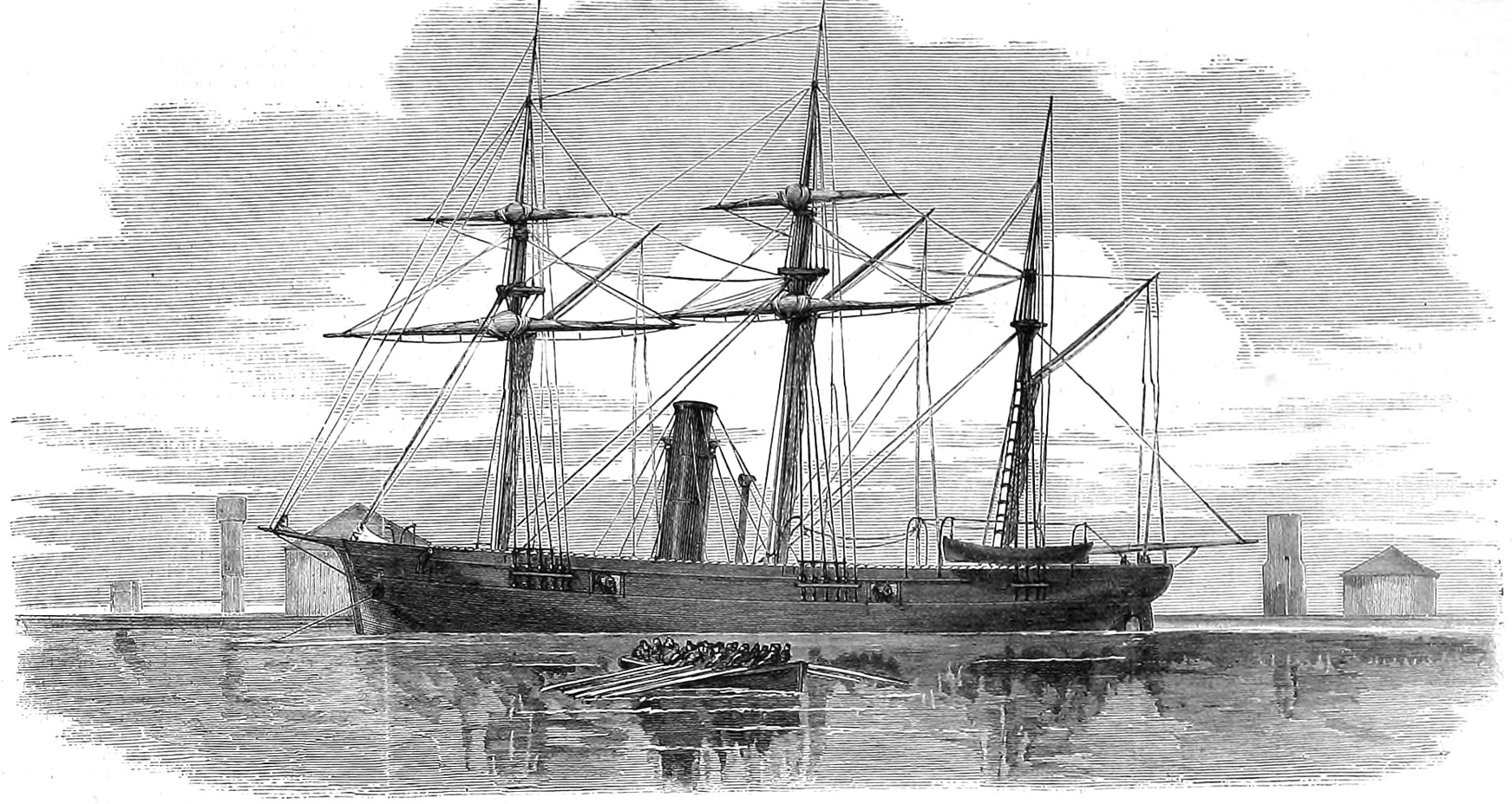 European and Asiatic Stations, 1870-1876. Shown in her configuration of 1870-1876 with a clipper bow and three masts. She had 14 boilers with two tall funnels instead of the two boilers and one funnel in her sisters, the contractor (Corliss) desiring to keep all of the steam generators below the waterline. These failed and were replaced with four boilers and the two shorter funnels shown here at the Washington Navy Yard in 1865-66.