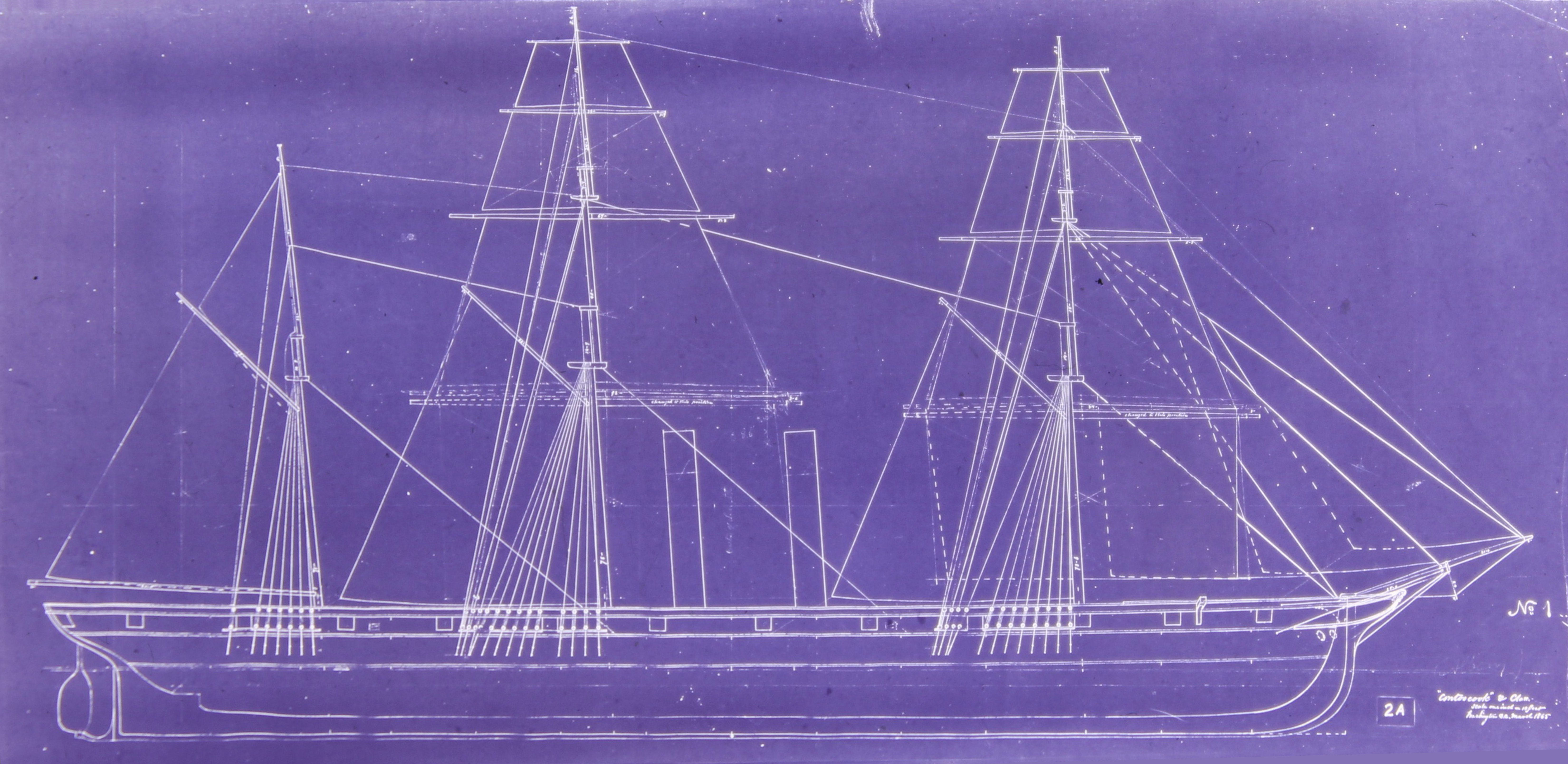 USS Albany, ex Contoocook (1864-1872) North Atlantic Station, 1868-1870. In March 1864 Contoocook was assigned an armament of one pivoted 60-pdr Parrott rifle on a short forecastle, two 24-pdr howitzers and two 20-pdr bronze rifles on a poop, and eight 9" Dahlgrens in an open broadside battery without a spar deck. She was completed thus in 1868 but had another six 9" guns added to the battery in October 1869. This rigging plan of "Contoocook & Class" without a spar deck was produced at Washington, D.C. in March 1865 and used at the Portsmouth, N.H. Navy Yard and is presented here as merged from two NARA images. Download large copy here. Photo No. NAID 7368237 Source: NARA Boston (Waltham), RG-181 |