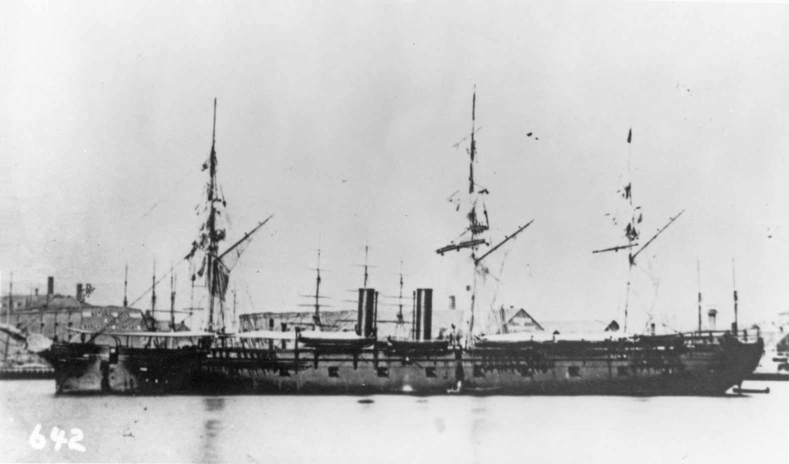 USS Congress, ex Pushmataha (1868-1883) North Atlantic and European Stations, 1871-1876. A spar deck was added during construction although she did not get quarter galleries. She is shown with the Venice waterfront in the background in 1874 or 1875. Photo No. 19-NC-4858 (NAID 353696453) Source: NARA RG-19 (also NH 61487) |