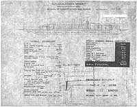 Photo #: S-584-030-A Proposed Battleship ... May 17, 1913 Preliminary design plan for a new battleship. This plan may have been developed to investigate the implications of reducing required speed to a more standard 22 knots in a new capital ship design concept that previously was based upon provision of comparatively high speed (25 knots.) This drawing is identical to Photo # S-584-030 except that the table of vessel component weights at the right is summarized into nine rather than eleven categories. This plan provides twelve 14-inch guns and a speed of 22 knots in a ship 640 feet long on the load water line (L.W.L.), 100 feet in beam, with a normal displacement of 36,500 tons. No ships were built of this type. Note: The original document was a blueprint (white on dark blue). The original plan is in the 1911-1925 "Spring Styles Book". U.S. Naval History and Heritage Command Photograph. Online Image: 407KB; 1500 x 1195 pixels |
