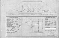 Photo #: S-584-063 Preliminary Design No.126 for a Scout Cruiser ... April 26, 1915 Preliminary design plan for a large scout cruiser, prepared to support General Board discussions concerning the characteristics sought in future cruisers. This plan provided four 14-inch guns and seven 5-inch guns and a speed of 35 knots in a ship 800 feet long on the load water line, 85 feet in beam, with a normal displacement of 25,000 tons. This design included 2,330 tons of armor, 8-inch side armor over 374 feet by 17 feet 6 inches amidships plus 1.5-inch deck protection, adding 14,500 tons displacement over design No.112. This design was last in a set of 11 undertaken as a group during 21 to 29 April 1915 to explore tradeoffs among armament, protection, and size in large scout cruisers capable of 35 knots speed. This design series took Preliminary Design No.112 (see Photo # S-584-050) as a baseline. Ultimately, however, no ships of this type were built. Note: The original document was a blueprint (white on blue). The original plan is in the 1911-1925 "Spring Styles Book". U.S. Naval Historical Center Photograph. Online Image: 220KB; 1600 x 1075 pixels |