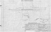 Photo #: S-584-170 Preliminary Design Sketch for a "33-knot Scout" Cruiser ... January 7, 1921 Preliminary design drawing for a scout cruiser. This design was one of many considered in the process of settling on the plans adopted for the Pensacola (CL-24) class of Fiscal Year 1926. This sketch was one of four undertaken as part of the work leading up to development of a set of five alternative designs (see Photo # S-584-174 to Photo # S-584-178) that were presented to the General Board in March 1921. This design provided one triple 8-inch gun turret forward and two turrets aft, one twin and one triple. Armor protection includes a narrow 2.5-inch side belt and a protective deck including an inclined segment 4.5-inches thick. This plan provided eight 8-inch guns, turbine machinery, and a speed of 33 knots in a ship 600 feet long on the waterline, 57 feet in beam, and with a normal displacement of 10,250 tons. Note: The original document was pencil on linen (black on white). The original plan is in the 1911-1925 "Spring Styles Book". U.S. Naval History and Heritage Command Photograph. Online Image: 229KB; 1725 x 1095 pixels |