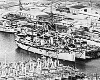 Note the ship's many wartime modifications, particularly to the bridge structure.