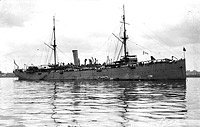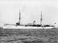 She is in her original configuration as an auxiliary cruiser with a main battery of ten 6" guns, including two on deck forward, probably two more aft, and six in the hull, plus two pole masts with fore-and-aft rig.