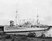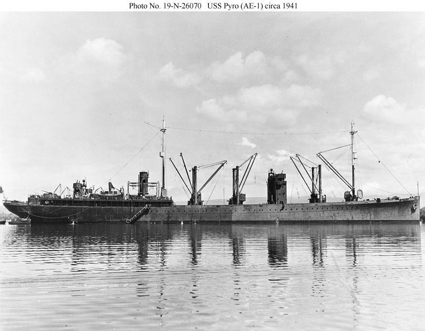 USS Pyro (AE-1) Shown circa 1941 after the addition of splinter protection (low bulkheads) around her four 5-inch and two 3-inch guns and the addition of positions for four .50 caliber anti-aircraft machine guns, two on the bridge and two next to the after searchlight platform. Photo No. 19-N-26070 Source: U.S. National Archives, RG-19-LCM |