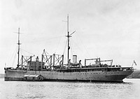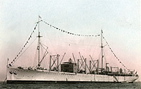 USS Pyro (AE-1) A colorized view probably showning the ship soon before decommissioning in 1924. The large boat davits have been moved forward to positions on each side of the smokestack and reduced in size, a modification not made on Nitro. The gun shields seen here were no longer in use when Pyro recommissioned in 1939. Photo No. NH 74663 Source: U.S. Naval History and Heritage Command. |