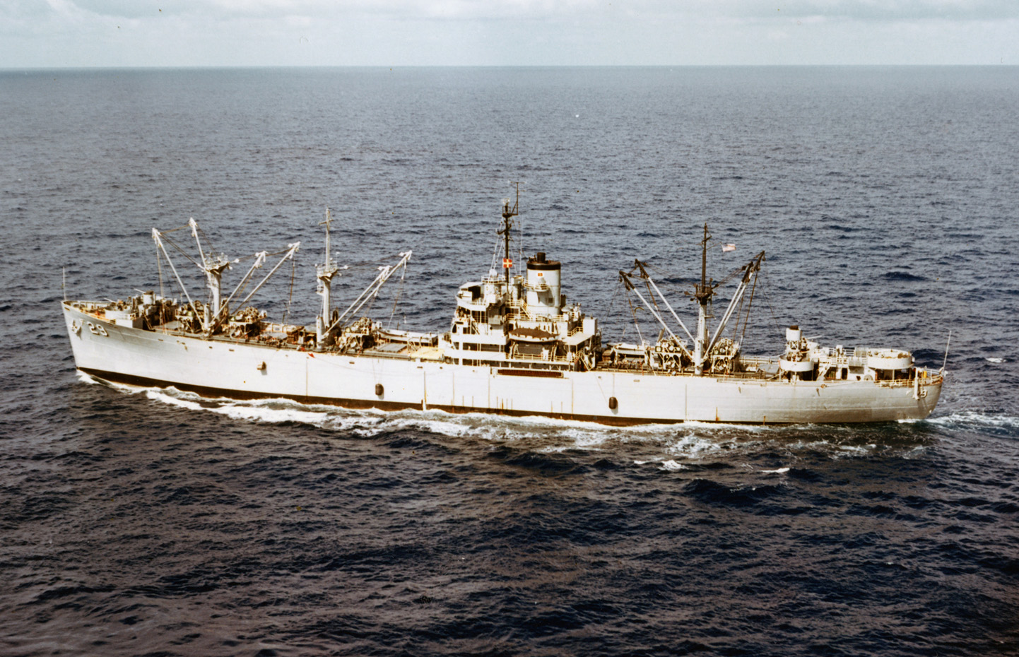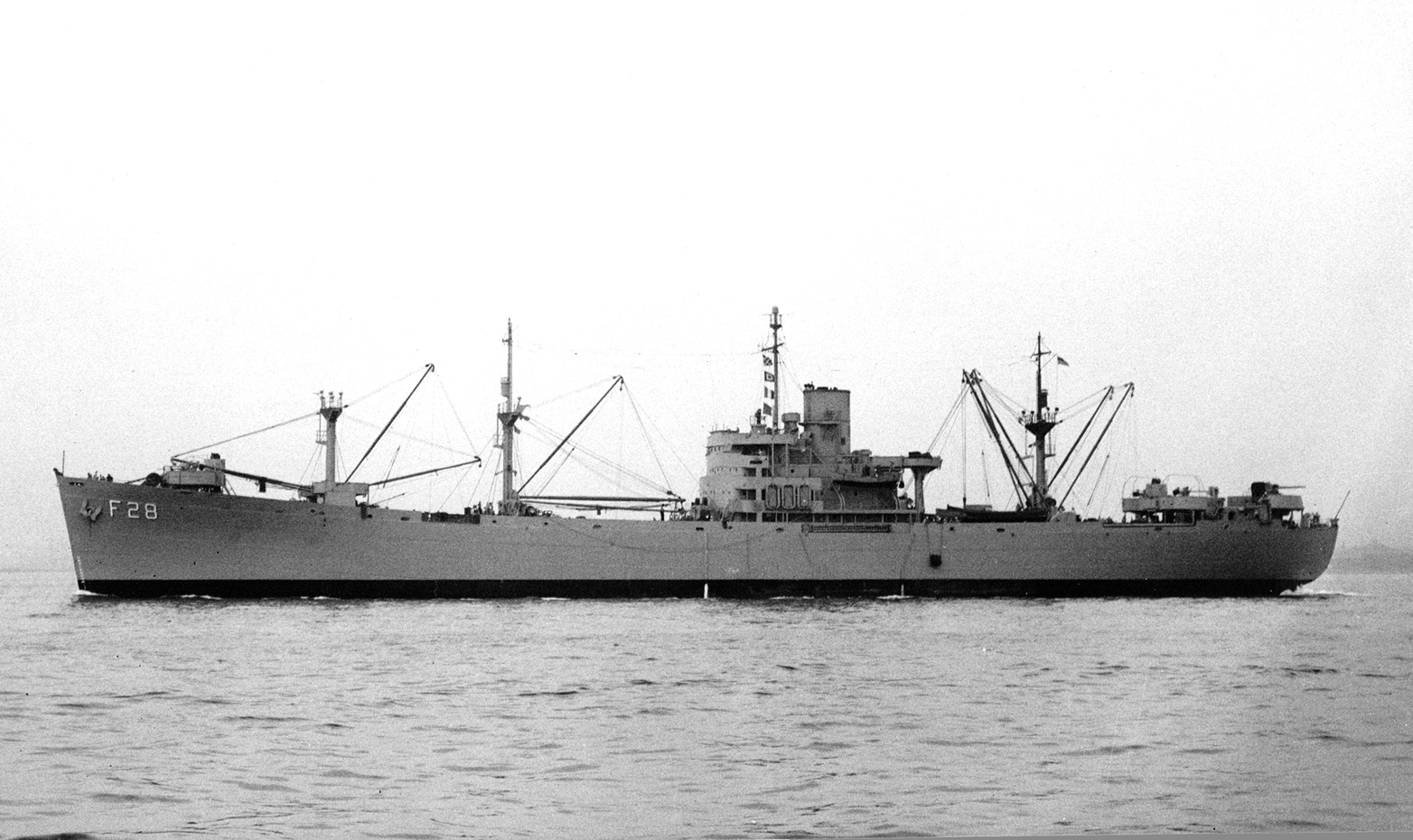 At sea on 14 September 1963 just before replenishing USS Kitty Hawk (CVA-63). Note the "Romeo" signal flag at the dip to port, indicating that replenishment operations are imminent on that side (the one used by carriers).