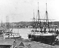 The yard's gun firing test building is to the lower left and a Casco class light draft monitor is beyond Relief's bow.