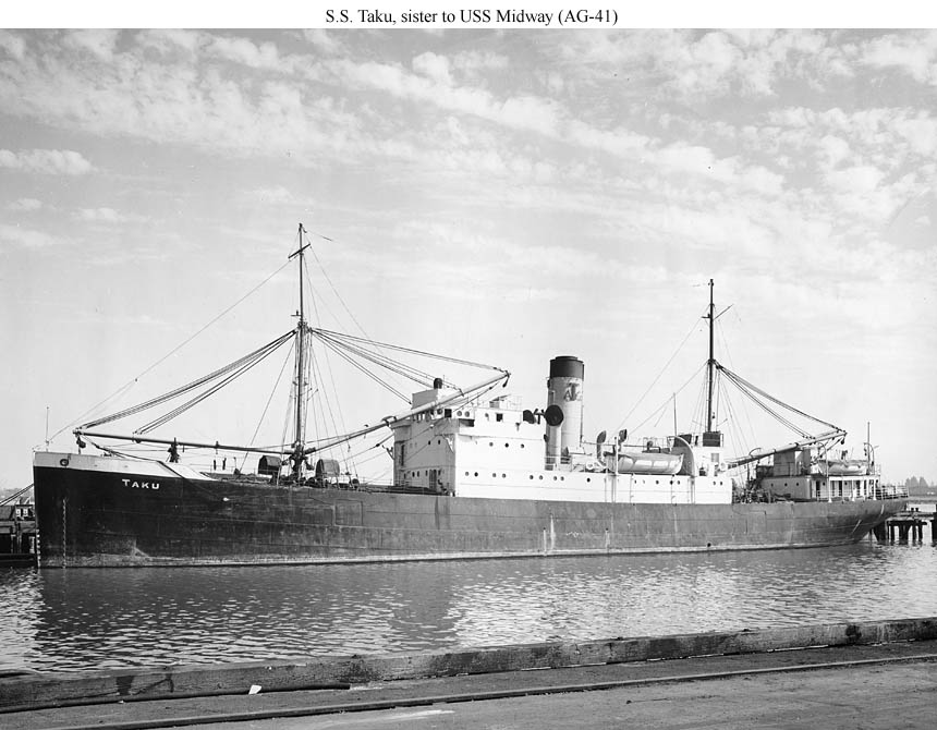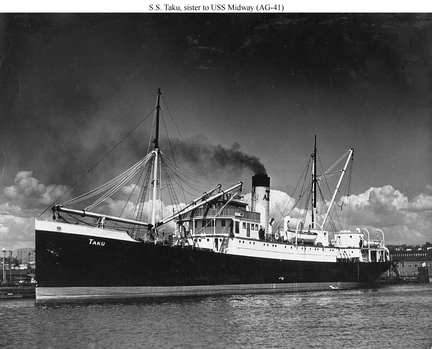 The sister of USS Midway (AG-41, ex S.S. Tyee). She is probably shown here soon after being acquired and renamed Taku in 1939 by the Alaska Transportation Co.