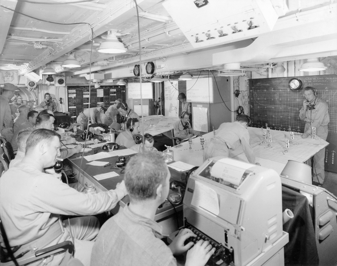 Scene in the Joint Operations Room, with situation boards (horizontal and vertical), communications, and command stations manned, on 3 July 1943, shortly before the Sicily invasion.