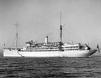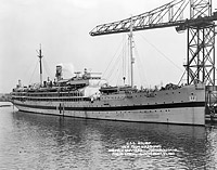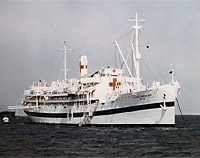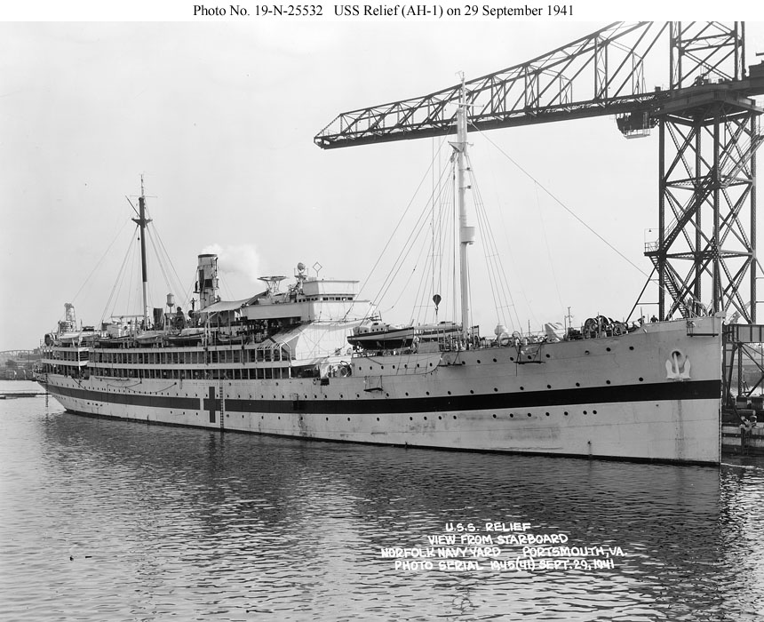 USS Relief (AH-1) At the Norfolk Navy Yard on 29 September 1941. War preparations included painting Geneva Convention markings on the ship and blanking out the numerous windows of the operating room under the bridge. Photo No. 19-N-25532 Source: U.S. National Archives, RG-19-LCM |