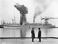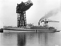 USS Relief (AH-1) Under the great hammerhead crane at the Philadelphia Navy Yard on 3 March 1921. The men in the foreground are not identified. Photo No. NR&L(M) 21046 Source: U.S. Naval History and Heritage Command. |