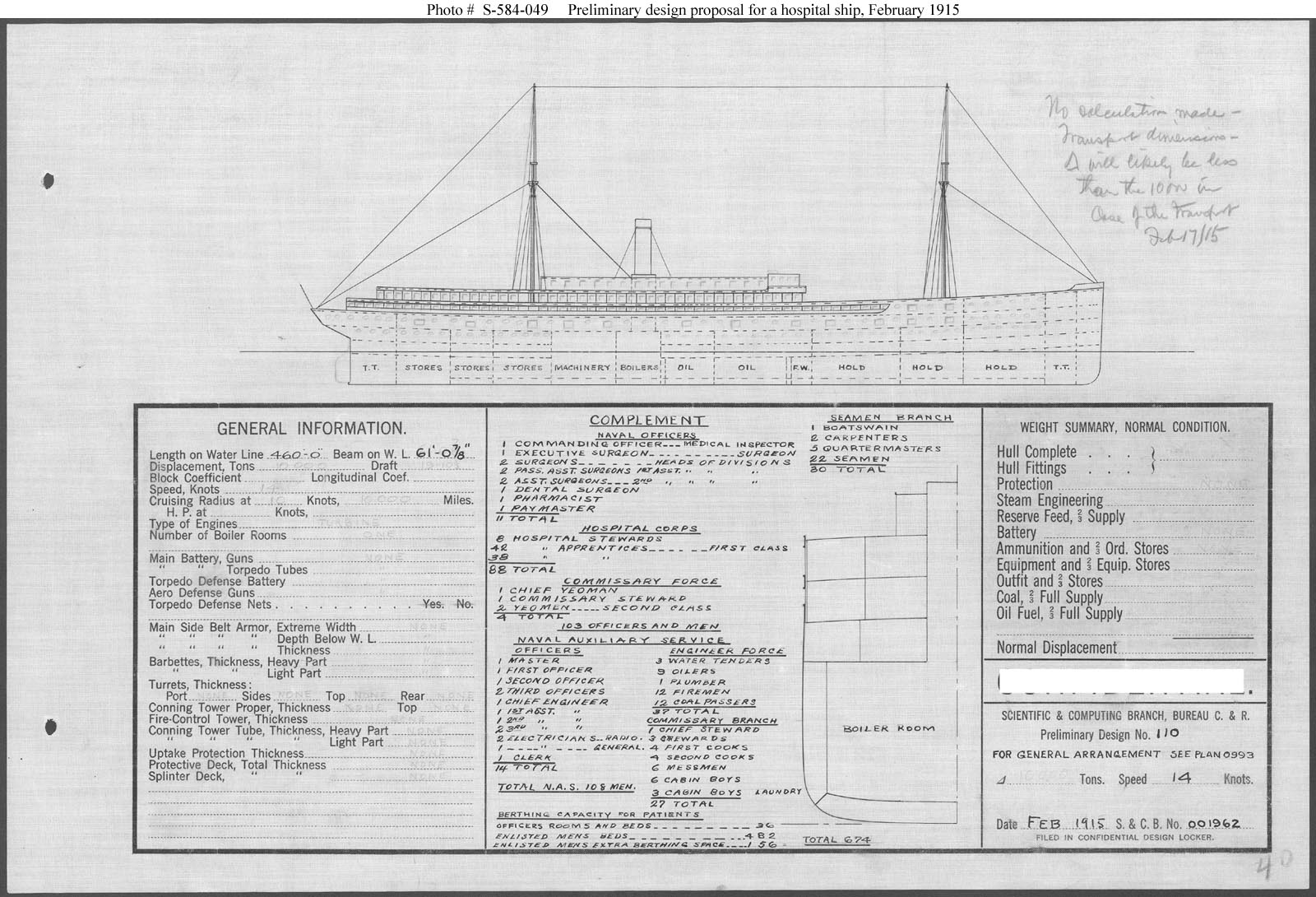 Preliminary Design Plan for a Hospital Ship ... February 1915