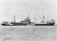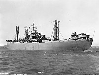 Preparing to lower a Sea Mule over the side in April or May 1945 during the invasion of Okinawa.