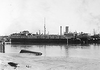 In service with the Atlantic Refining Co. circa the 1920s with a peacetime rig of two masts. This firm used unusually elaborate funnel markings during this period. The oval contains the company's name and, in the middle, the word "oils."