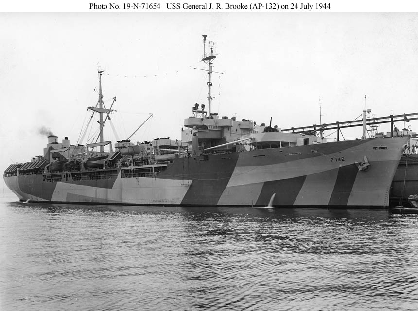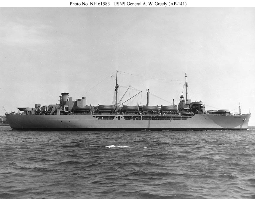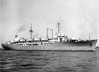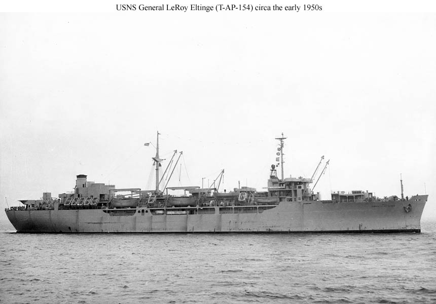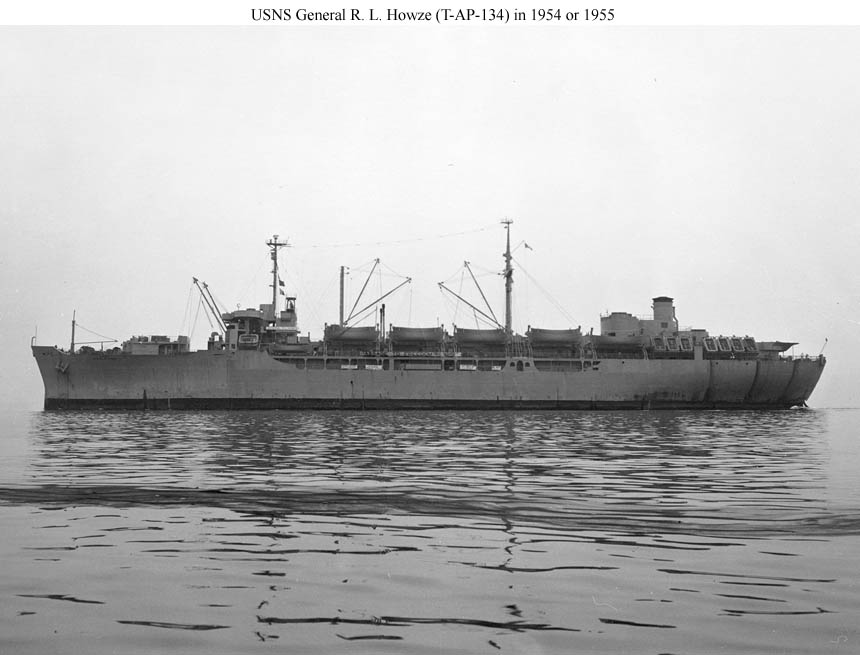 Departing Charleston, S.C., on 9 March 1954 after loading troops there. Note her updated lifeboat arrangement and the goalpost mast aft of the bridge.
