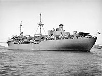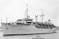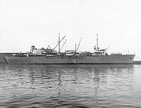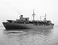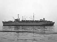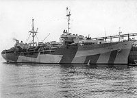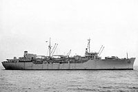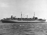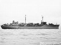 Shown in Navy service after receiving a safety at sea conversion, in which the two Welin boat davits on each side were replaced by five merchant type boat davits, substantially increasing the ship's lifeboat capacity. Usually during this conversion, all ships also received an enhancement to their cargo handling capability in the form of a single kingpost amidships, as in this ship, or a goalpost mast aft of the bridge.