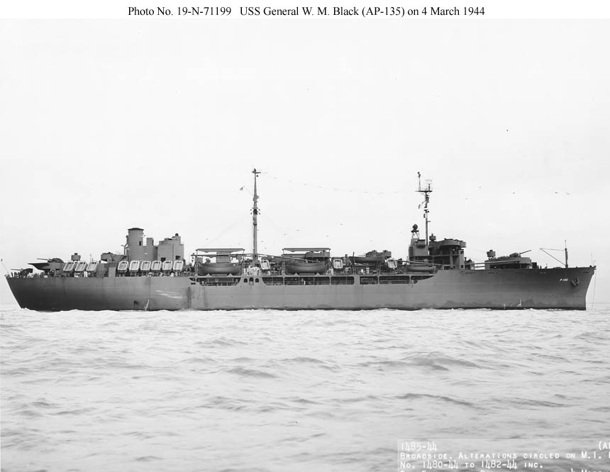 Immediately after acquiring most of the ships of this class from the Navy in 1946 the Army gave them austere conversions for manning by civilian instead of Navy crews. The ships had already been disarmed by the Navy. The Navy received this ship from the Army in 1950 in her 1946 configuration with her original Welin boat davits, without the later safety at sea conversions received by many of her sisters.
