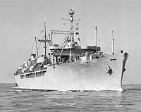 The Navy received this ship from the Army in 1950 in her 1946 configuration with her original Welin boat davits, without the later safety at sea conversion received by many of her sisters. The Army, however, did give her a large but light goalpost mast aft of the bridge to enhance her cargo handling capability.