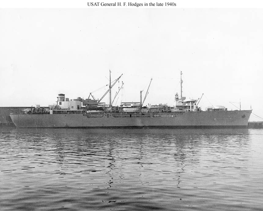 In Army service circa 1949 after receiving a safety at sea conversion, in which her lifeboat capacity was increased and a goalpost mast was added aft of the bridge to increase her cargo handling capacity.