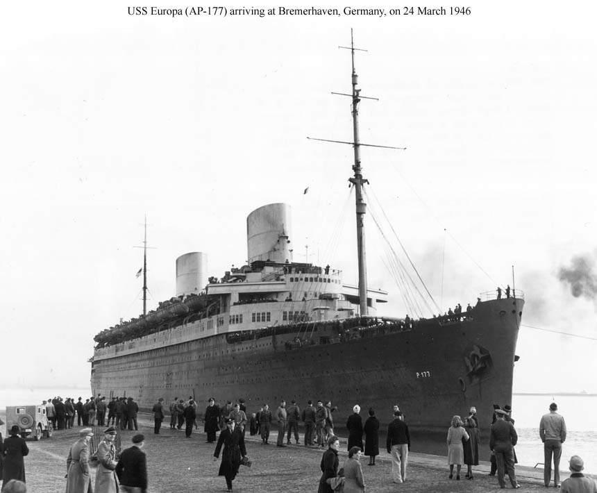 Arriving at Bremerhaven on 24 March 1946 at the conclusion of her last transatlantic voyage as a U.S. Navy ship.