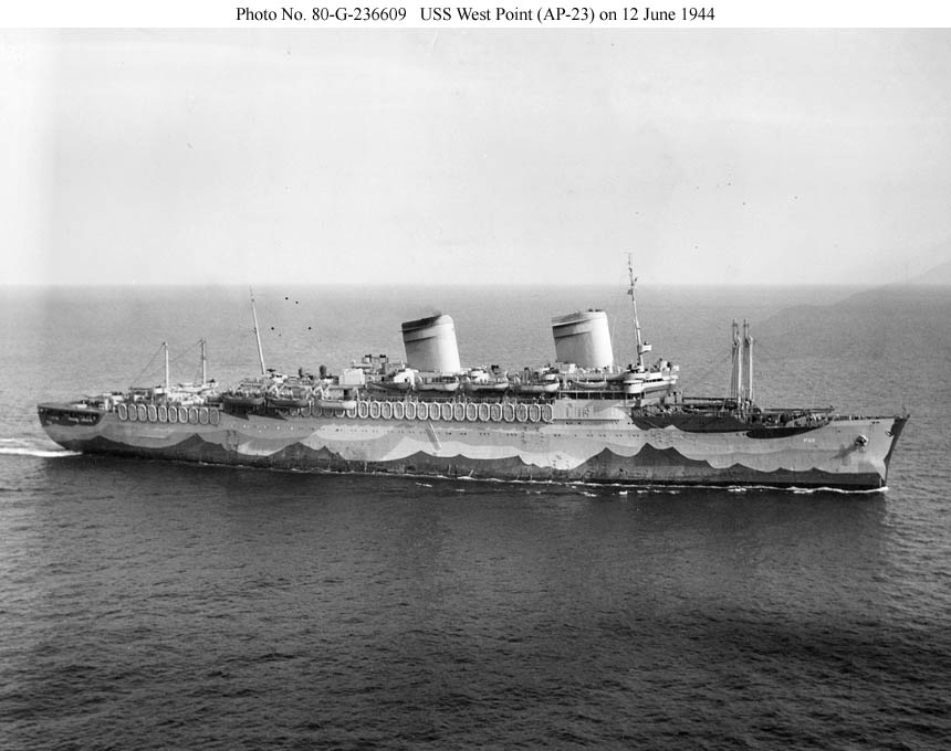 Banners hanging from her superstructure identify the following U.S. Army units (from left to right): Fifth Corps; 347th Infantry Regiment; and 87th Infantry Division. Note West Point's pattern camouflage.