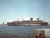 Steaming past the Statue of Liberty, bound for the New York City docks, while transporting troops home from Europe, 11 July 1945.