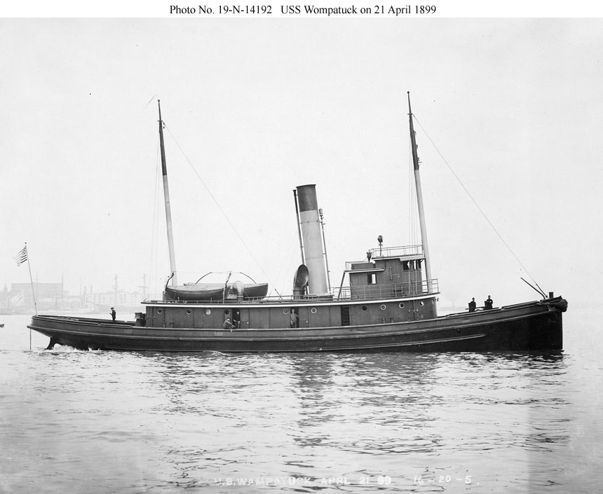 Photographed on 21 April 1899. Wompatuck arrived in Manila Bay in April 1901 and was stricken there as a tug in February 1938. Although large and seaworthy enough to travel half way around the world, she was designated YT-27 instead of AT in 1920, probably because she was attached to a naval base (Cavite) and not to a fleet.