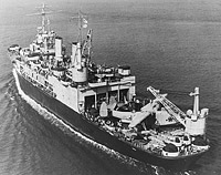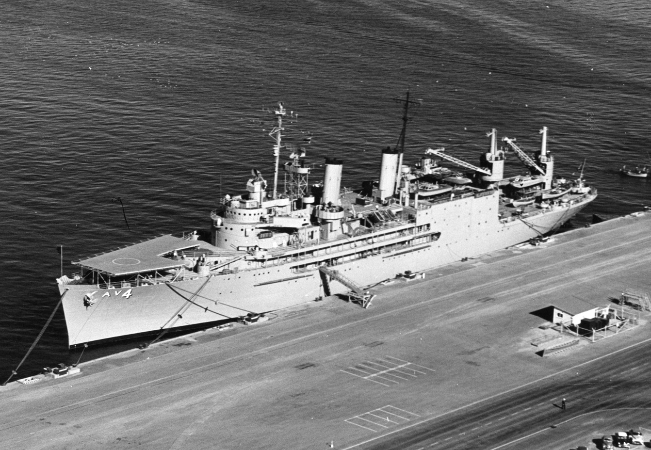 Photographed in the Azores on 21 August 1958 with her stern showing the extensive modifications made to enable her to handle the projected Martin P6M Seamaster flying boats. She was in the Azores to take scientific readings for Project ARGUS, atmospheric nuclear tests in the South Atlantic conducted from Norton Sound (AVM 1). Note the scientific equipment on her after deck.