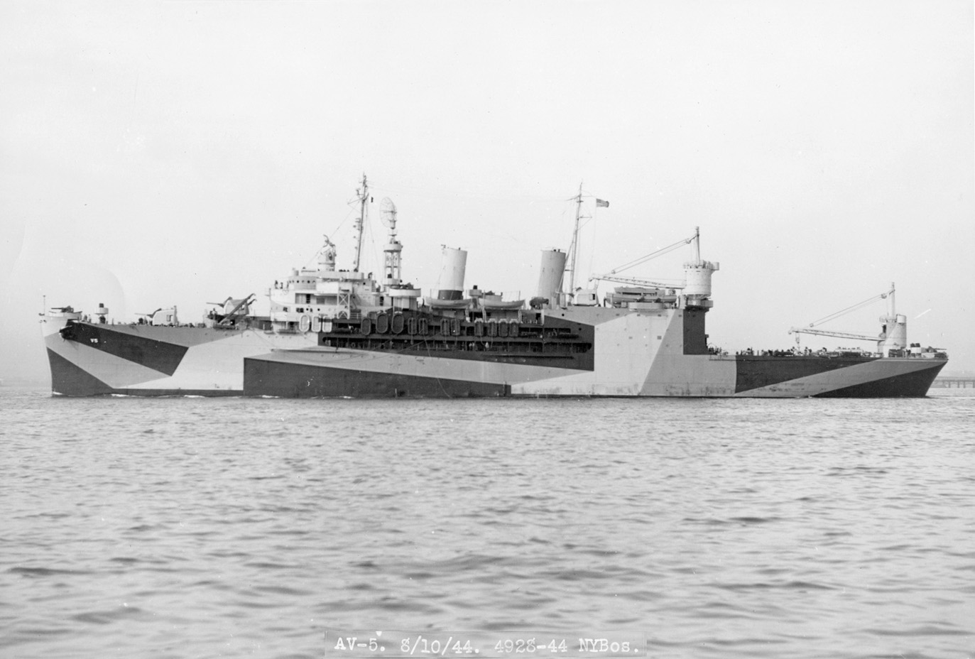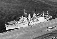 Photographed in January 1958, probably at Guantanamo Bay, soon after recommissioning and after the first stage of her conversion to support the P6M Seamaster jet flying boat. Note the well in the stern for a ramp and hoisting gear (never installed) that were to enable the ship to bring the huge P6M on board without using a crane. The P6M program was cancelled in August 1959 and Albemarle never serviced this aircraft.