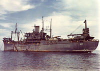 At Apia, Samoa, on 20 April 1943 with a disassembled PBY-5 seaplane on deck.