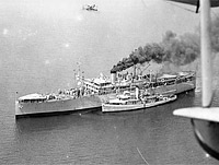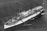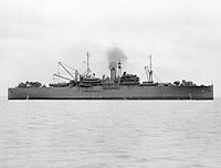Probably shown arriving on 31 October 1920 under tow at her conversion shipyard in Hoboken, N.J., from her builder's yard at Hog Island, Pa. She grounded in attempting to enter her slip (possibly shown here) and was floated and tied up temporarily to other vessels. She is a standard Hog Island Type B transport (EFC Design 1024) with many items in the after part of the ship, including both goalpost masts, not installed. Photographed by Todd Shipyards Corp., owner of the Hoboken yard.