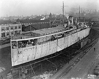 The sides of the kite balloon well are clearly visible below the balloon platform, which covers the entire after portion of the ship. The 100-foot long well is covered with pieces of canvas. The ship's armament, which included two 5"/51 guns on the stern under the balloon platform, has not yet been mounted.
