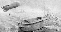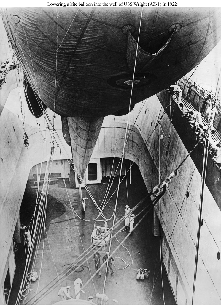 Artist's concept of the ship flying a kite balloon above the ship's open balloon well. Note the observers in the basket suspended under the balloon.