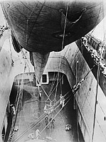 Lowering a kite balloon into the ship's balloon well after a flight.