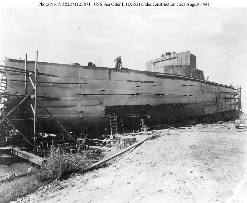 The relationship between this photo and the one above is not clear. The basic hull is the same, but it is on a different building ways, has the raked addition to the bow, and lacks the second superstructure level in the photo dated 20 August. The bow lacks paint while the rest of the hull is painted. The shed under the building ways has a sign showing the builder's number for Sea Otter II, Hull 215.
