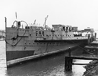 The massive wooden superstructure has been removed, and all that is left about forecastle deck level is four boiler uptakes, a structure over the engine room, and the paddle boxes.