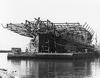 The flight deck is being fitted with the ship afloat and barges in use as work platforms.