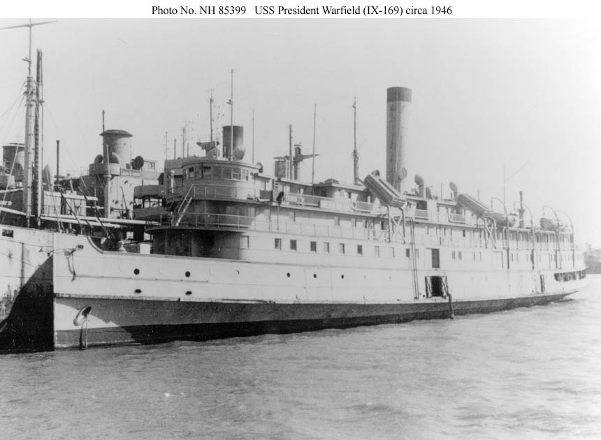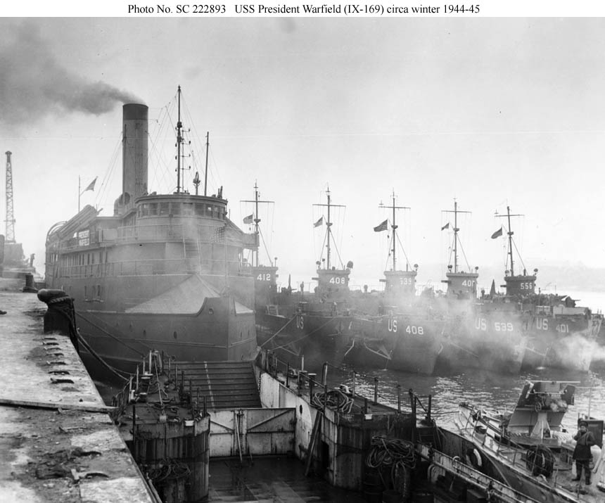 Alongside are USS LCI-412, LCI-408, LCI-539, LCI-401, and LCI-556. In the right foreground is HMS ML-248. The nameboard that President Warfield displayed at Omaha Beach in June 1944 is still present, but since then she has rigged a cover over her forecastle.