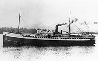 An underway view showing the civilian configuration of this wooden-hulled passenger and cargo steamer.