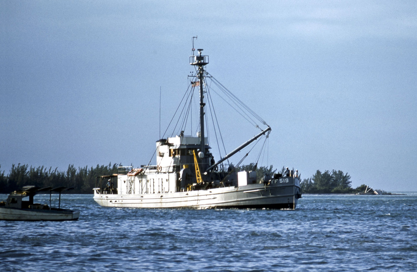 YF-852 underway at the U.S. Naval Station, Roosevelt Roads, Puerto Rico, on 15 September 1965. She had just been named Ensenada on 19 July 1965. She was redesignated as the self-propelled range tender YFRT-523 with name cancelled effective 1 April 1971 to support submarine training at the underwater torpedo range off St Croix, U.S. Virgin Islands.