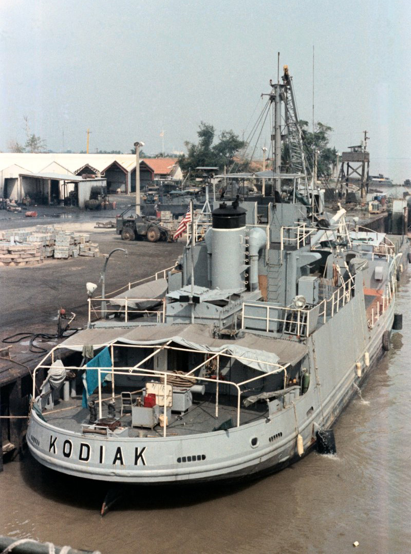 Kodiak (YF-866) moored at Nha Be, South Vietnam, in October 1971. She replaced Kodiak (LSM-161) in Alaska and took her name on 21 April 1965. (Photo: NavSource 144386603 © Richard Leonhardt)